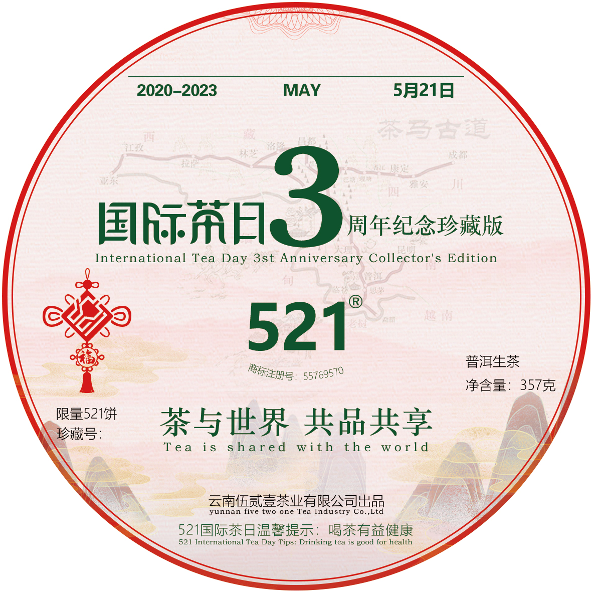 - 2019年12月19日第74屆聯(lián)合國大會通過決議,將每年5月21日定為“國際茶日”,應“國際茶日”確立之契機,我公司注冊了521商標,并以弘揚中國茶文化為使命,刺激茶葉消費活力,促進茶產業(yè)健康發(fā)展己任,深挖521品牌潛力,成就521品牌價值.......