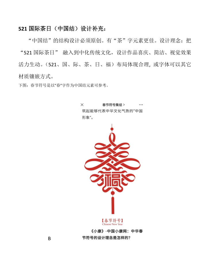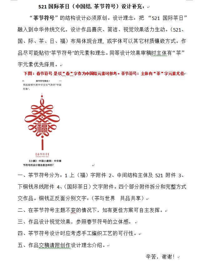 - 設計結合521國際茶日和中國元素、設計思想采用“中國結”作為logo(吉祥物)。 用絲繩編(視覺效果)織中國結,主體分六個部分:中間凌形方塊編織成521數字、四個凌形角各生展四個小凌形方塊,每方塊內分另編有“國、際、茶、日”四個字,上方的凌形角上方有土圓燈籠形,內編有(福)字。最上部掛線、最下部一串梳線。(設計思路僅供參考)歡迎提供更佳方案。