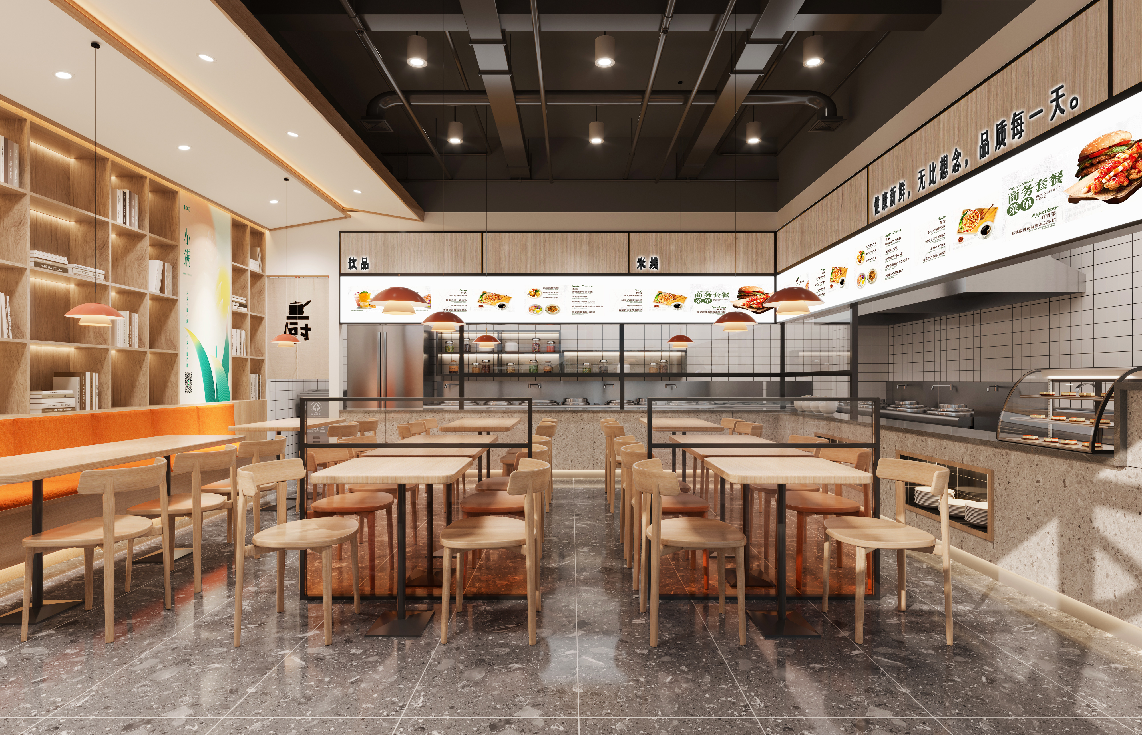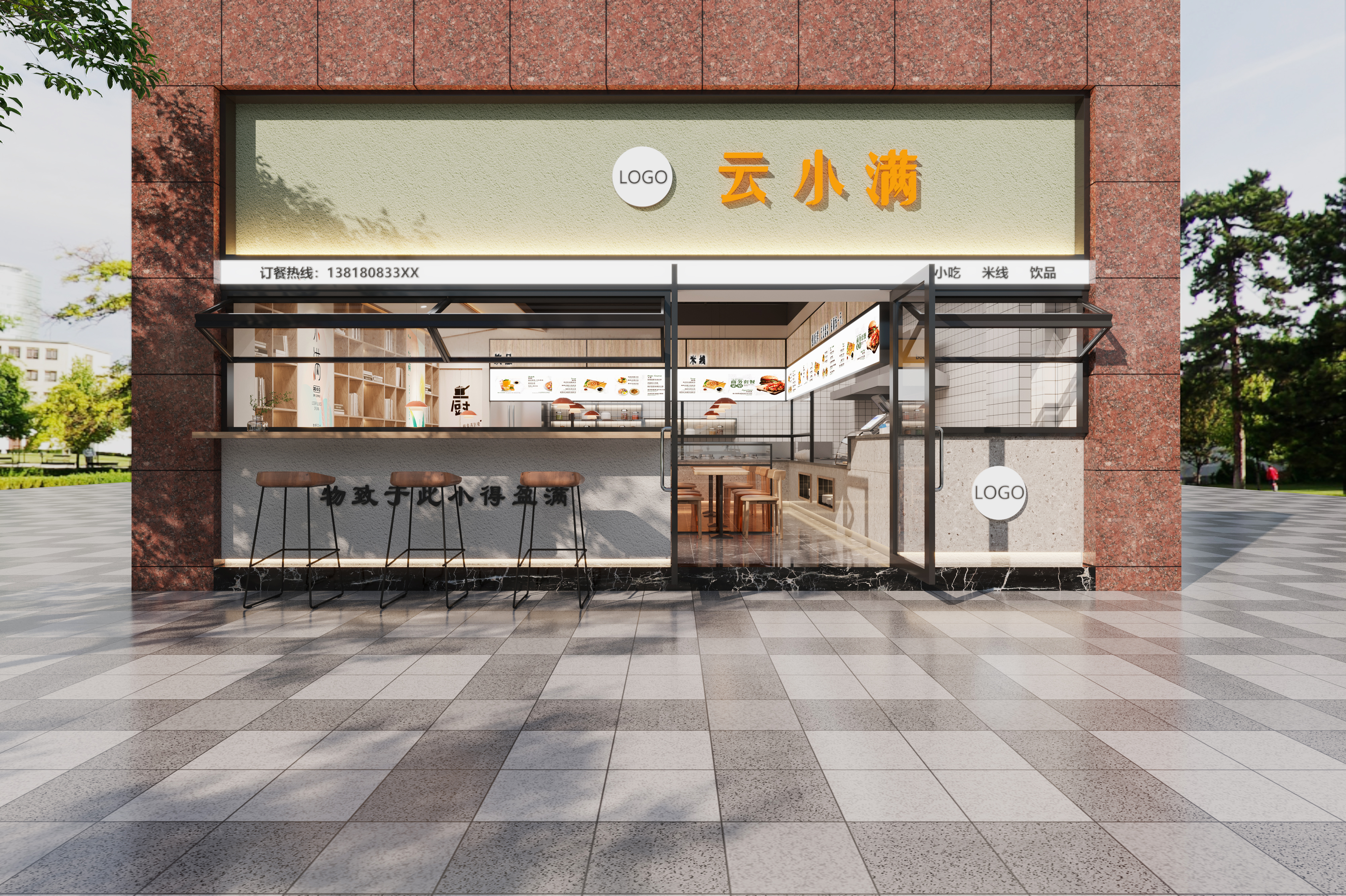 - 附件有門店裝修效果圖,結(jié)合現(xiàn)有色調(diào),以清爽簡(jiǎn)潔風(fēng)格為主。 突出余生小滿的字體設(shè)計(jì)效果再搭配餐飲元素